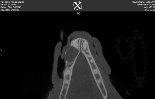 Expanding dentigerous cysts are not often identified when evaluating the oral cavity of an awake animal. The most common clue, leading to suspicion of a dentigerous cyst, is a missing tooth that failed to erupt. It is important to remember that missing teeth are not always truly missing. Often teeth fracture, leaving behind a portion of the tooth below the gum tissue. Impacted teeth that fail to erupt often lead to dentigerous cysts. For this reason, any missing tooth needs to be further evaluated.