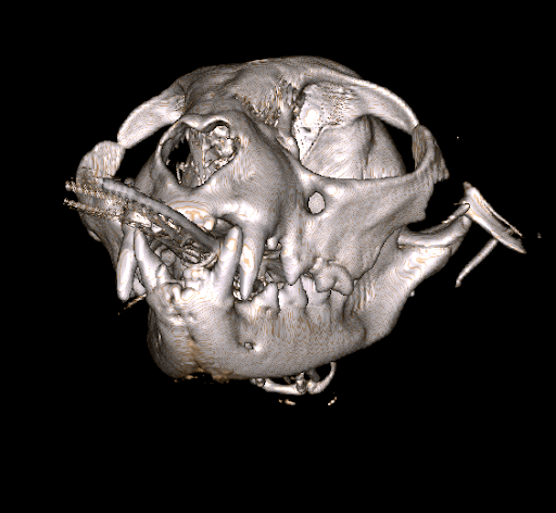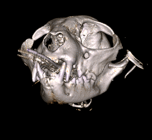 Figure 3. Three-dimensional reconstruction from cone computed tomography scan of a cat with a fracture of its zygoma bone. The fracture was the result of being attacked by a dog. The CBCT scan was completed at Animal Dental Care and Oral Surgery in Colorado Springs.