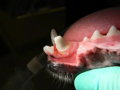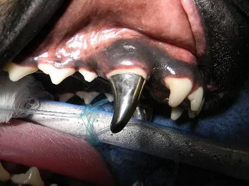 Figure 3. A metal crown on a canine tooth of a dog four years after it was cemented in place.