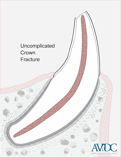 Trauma to the tooth can result in a tooth fracture. Commonly, tooth fractures are a result of inappropriate chew toys (rocks, antlers, bones, etc) or other trauma. Tooth fractures are painful, but dogs rarely show symptoms of pain, and so these fractures may go unnoticed. Crown fractures are divided into uncomplicated or complicated crown fractures.