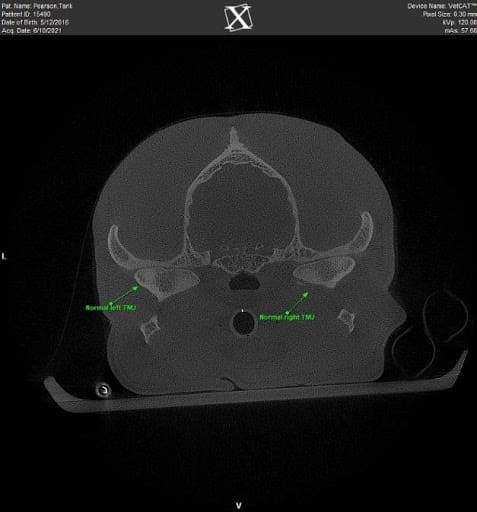 TMJ disease is diagnosed most accurately through imaging. Skull radiographs are beneficial but often are challenging to interpret as they are two-dimensional images. Cone-beam CT imaging provides 3-D evaluation and is invaluable for diagnosing TMJ disorders. This imaging modality is completed under general anesthesia, with imaging results in less than 4 minutes in most patients.