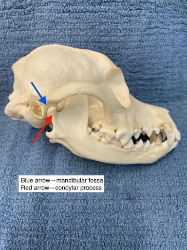 Anatomically, the condylar process of each mandible articulates with the mandibular fossa of the temporal bone. A fibrocartilaginous disc provides a cushion at the joint surfaces. The TMJ in dogs plays a role in occlusion (or the way teeth meet) and is prone to developmental, traumatic, and age-related diseases.
