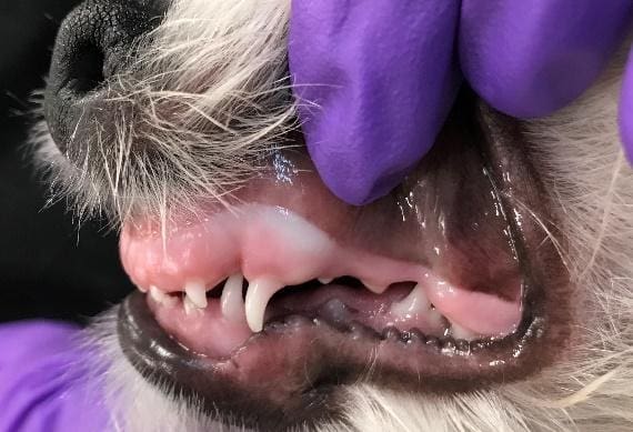 Picture 2. An image of the hard palate of a puppy with a class II malocclusion (mandible is abnormally short). The deciduous canine teeth are in traumatic occlusion with the palatal tissue. Note the depressions and trauma of the palatal tissue located on the inside aspect of the upper deciduous canine teeth